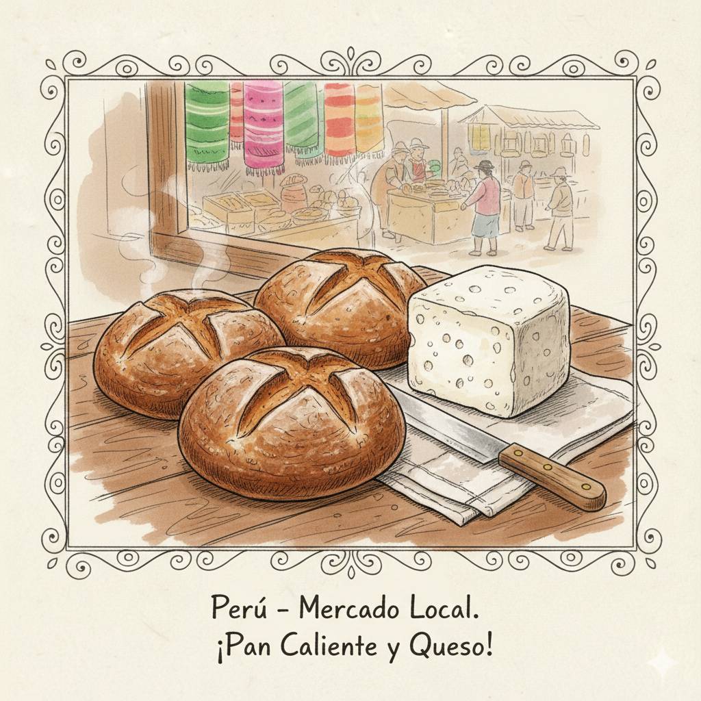 メルカド(市場)のパンとチーズ: 焼き立ての香ばしいパンに、地元の濃厚なチーズを挟んで。シンプルだけど最高の贅沢です。